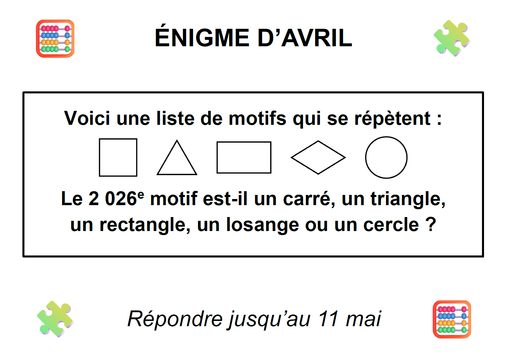 Réfléchis bien, puis dépose une seule réponse avec nom, prénom et classe sur un papier d'environ 10 cm de diagonale, dans l'urne en salle d'étude. Tu as jusqu'au 11 mai.