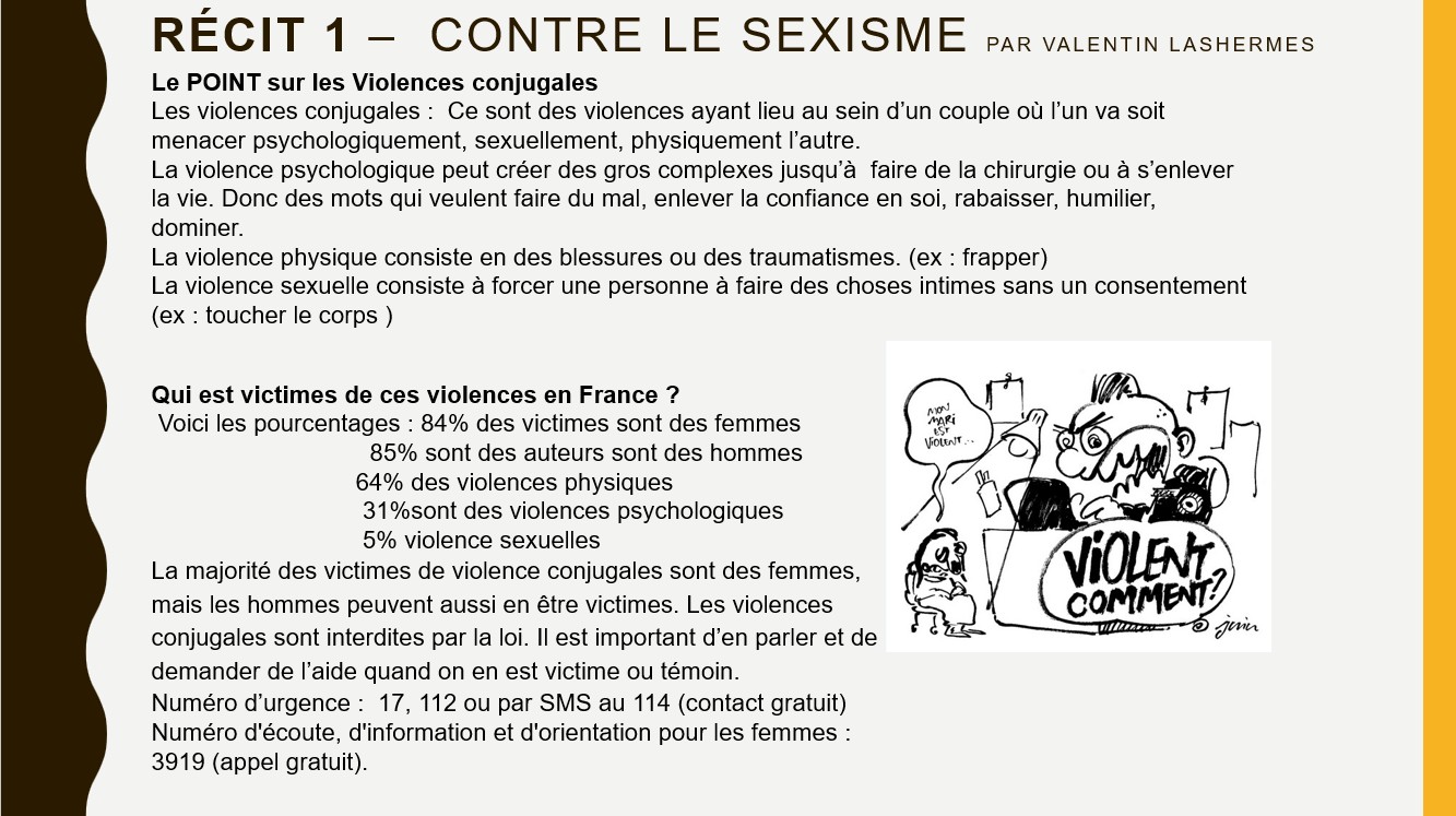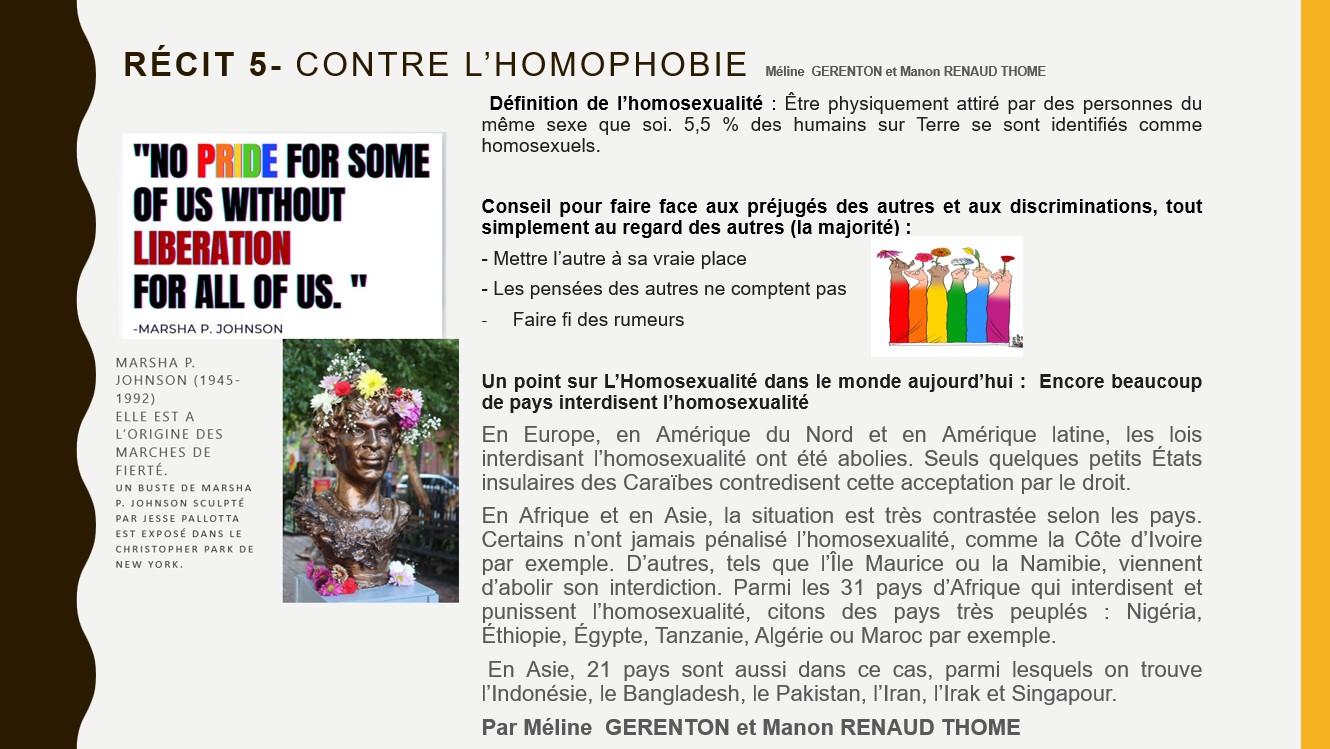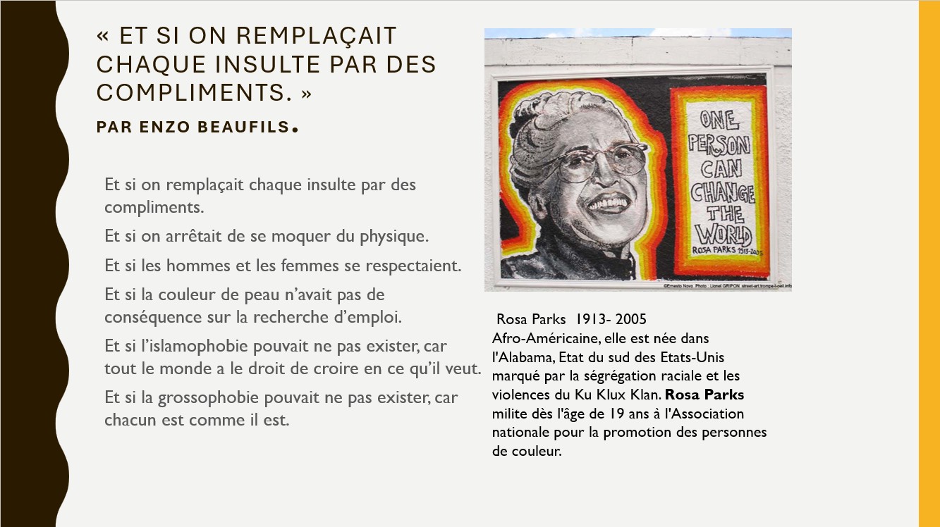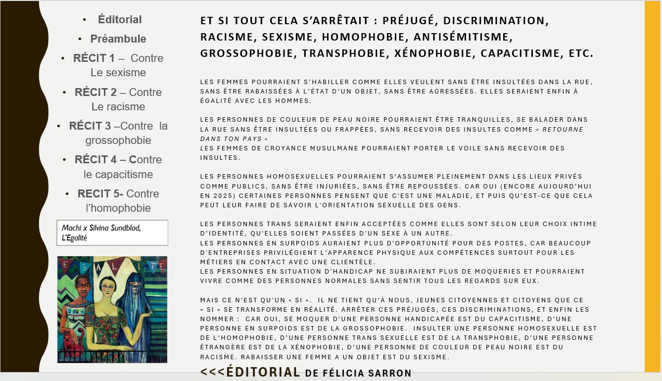 Ils ont acquis d'abord des savoirs, puis s'en sont emparés par des recherches sur une thématique qui leur tenait plus à cœur en groupe ou individuellement . Certains articles débutent tous par "Et si" avec l'objectif de changer le monde et la vision inégalitaire encore existante qui repose souvent sur des préjugés. D'autres sont plus informatifs et apportent des chiffres, des données sur les différentes discriminations qui touchent encore de nombreuses personnes. Ce journal est le fruit de leur travail collectif. Les illustrations ont aussi fait l'objet d'un choix éditorial, celui de mettre en valeur des œuvres actuelles inspirées des luttes de grandes personnalités. Bonne lecture.
