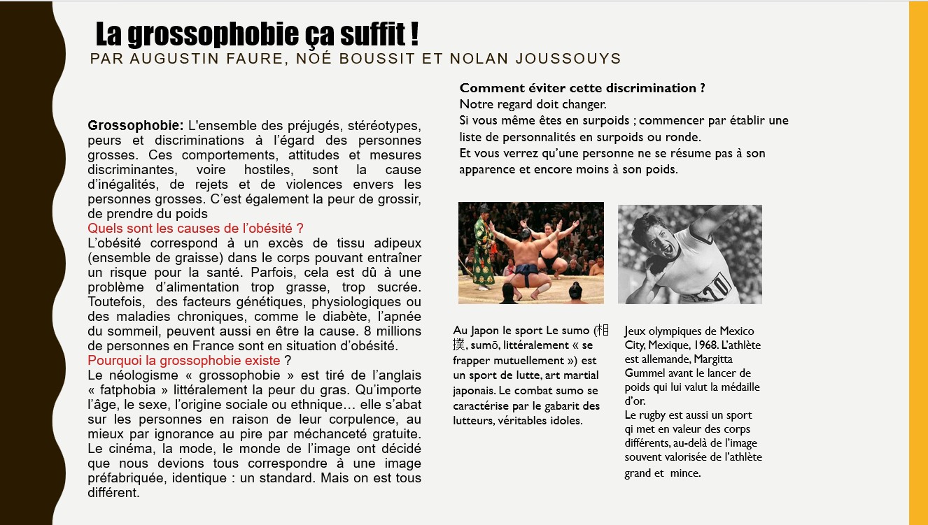 Dans le cadre des cours d'EMC (Enseignement Moral et Civique) et d'EMI ( Éducation aux médias et à l'information), tous les élèves de 5ème ont réfléchi aux notions de préjugés, stéréotypes et discriminations.
