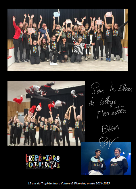 Les élèves et les personnels sont conviés à venir assister à la projection de la finale du Trophée d'impro au théâtre Marigny à Paris Juin 2025, ce jeudi 02 Octobre 2025 en salle 111 à 13h15 afin de découvrir un match d'improvisation !